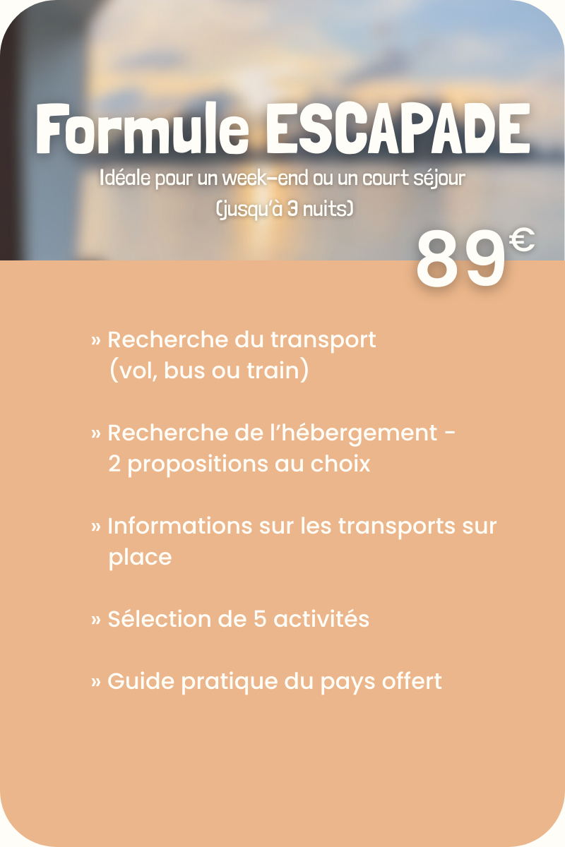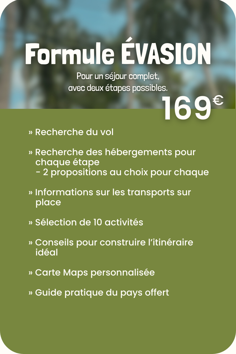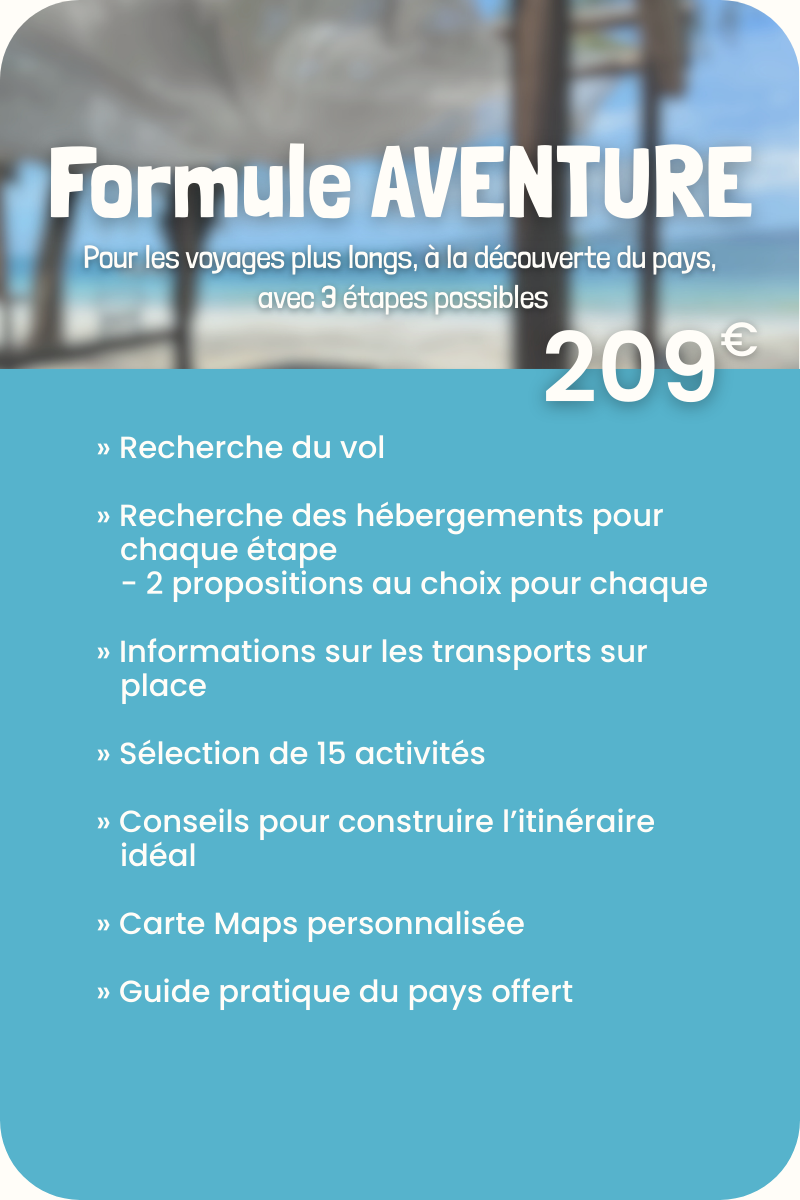 Après réception du paiement, je me lance dans les recherches et je construis pour vous un voyage complet et personnalisé : hébergements, transports, activités, conseils pratiques (en fonction de la formule choisie)…